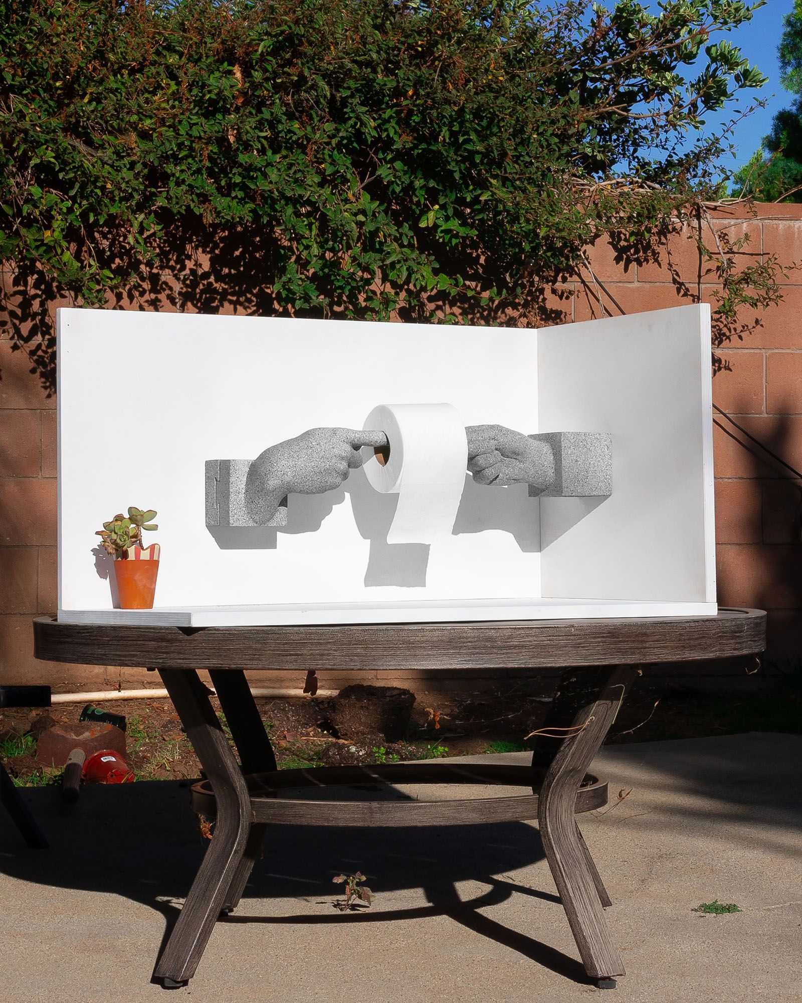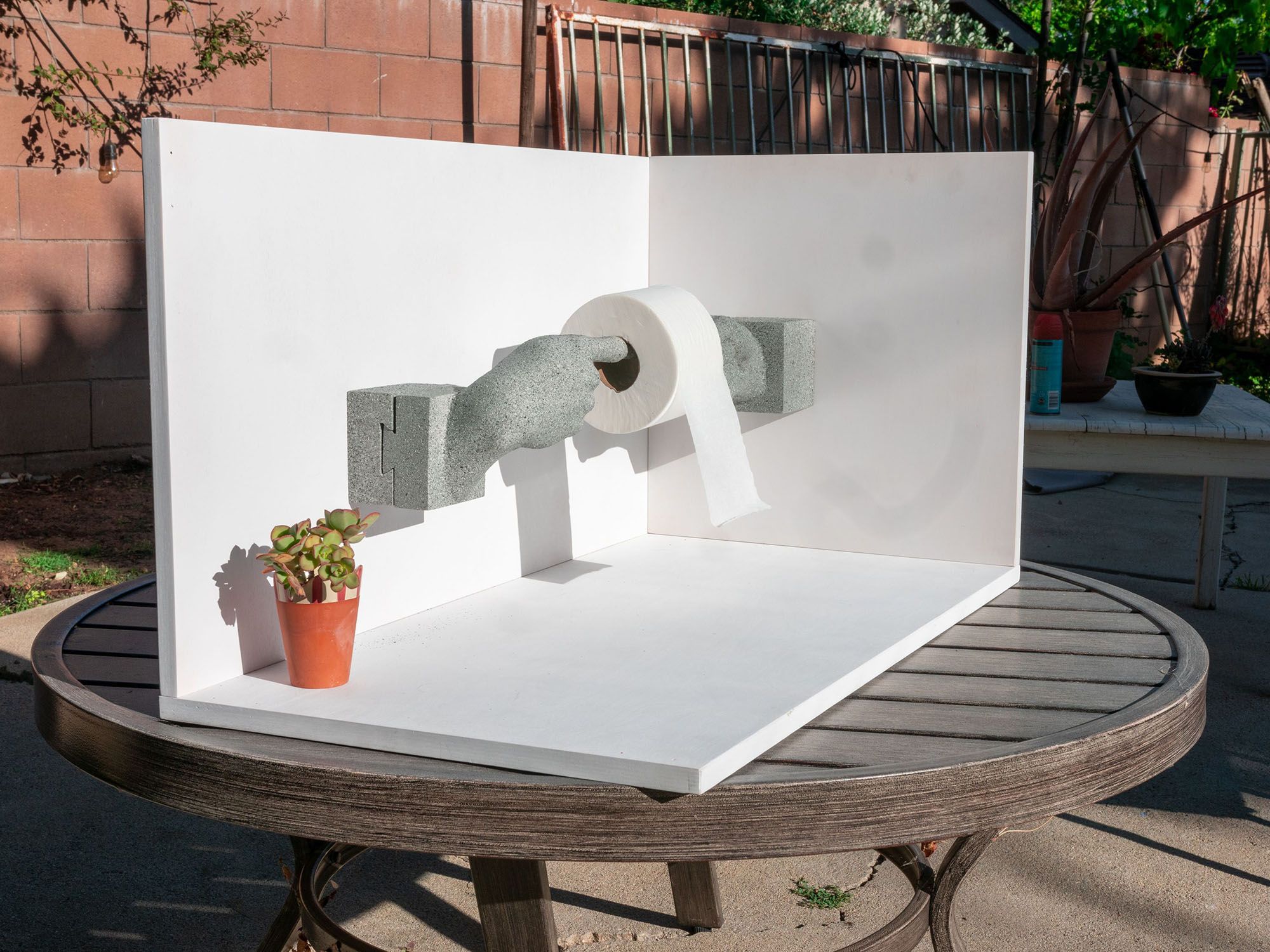 Touching Tips is an exploration into functional furniture, rethinking mundane household objects that are taken for granted. At the end of 2020, Marta, a gallery in Los Angeles, presented "Under / Over". The exhibition brought together a global group of artists with the prompt to redesign the toilet paper holder in form and/or function.